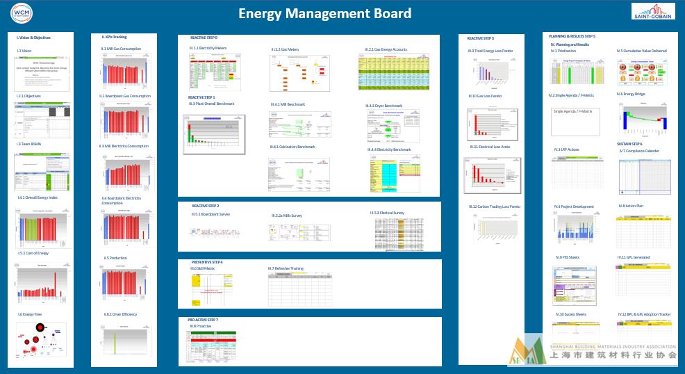 能源成本在圣戈班的產品成本占比較高中,因此圣戈班集團和企業對于能源管理建立了自己獨特的管理體系。在WCM(世界級制造)的管理體系中,專設能源管理內容,由專職人員進行工廠能源統計監測與分析,與圣戈班集團內部其他工廠進行最佳實踐對標,找出差距并分析相關損失內容和原因,制定年度管理計劃。通過技術改進和管理改進等手段,來達到相關的年度能耗目標。