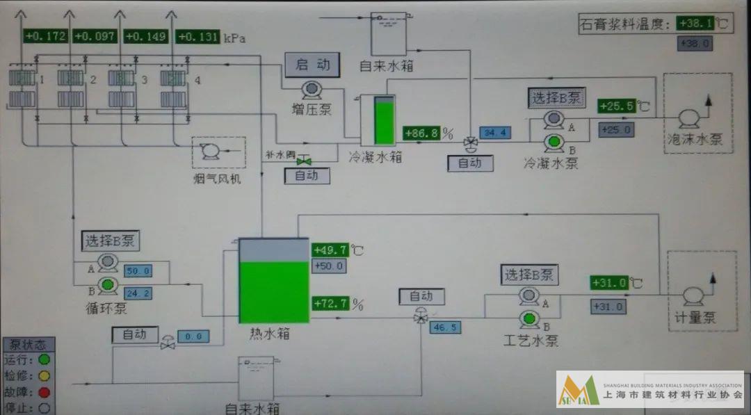 工廠烘箱用天然氣加熱空氣后在烘箱內部與石膏板接觸,使得潮濕的石膏板把內部的水分蒸發出去,大量的水汽通過煙囪外排至廠外。石膏粉摻水后進入鋪料機,貼面紙后切割成濕石膏板,送入烘箱進行干燥,將原摻入的水份排出,得成品的石膏板。當環境溫度低時,水溫也低,此時的濕石膏板溫度也低,送入烘房將消耗更多的燃料。通過對熱循環水系統改造,在烘箱排煙氣管道上加裝煙氣-水換熱裝置,冬季回收煙氣余熱加熱工藝水,提高進入烘箱的板溫,把工藝用的自來水通過與水汽進行熱交換,自來水水溫從室溫增加至33-35℃溫水,利用石膏粉的水合效應,在理想的水溫下激活水合,加快水合反應。使得石膏板在沒有進入烘箱前就完成了部分水分自我蒸發,降低了烘箱的蒸發負擔,節省了大量的天然氣消耗,從達到節能降耗的目的,同時將原來排至大氣中的水蒸汽經過熱交換后凝結成水,重新進行回用,節能的同時還節省了耗水量。年節約能耗近500噸標準煤。